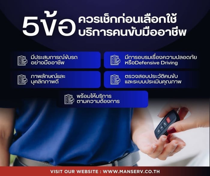บริการคนขับมืออาชีพระดับผู้บริหารต้องรู้วิธีขับรถให้ปลอดภัย, รู้จักเส้นทางสำคัญ, จุดจอดรถที่เหมาะสม รวมถึงต้องรับมือกับสถานการณ์ไม่คาดคิดได้ดี ซึ่งจะแสดงออกถึงความเป็นมืออาชีพได้อย่างดี เหมือนกับที่ทาง Manserv มีการอบรมพนักงานขับรถผู้บริหารอยู่เสมอ เพื่อให้สามารถเตรียมรับมือกับเหตุการณ์ได้ทุกรูปแบบ